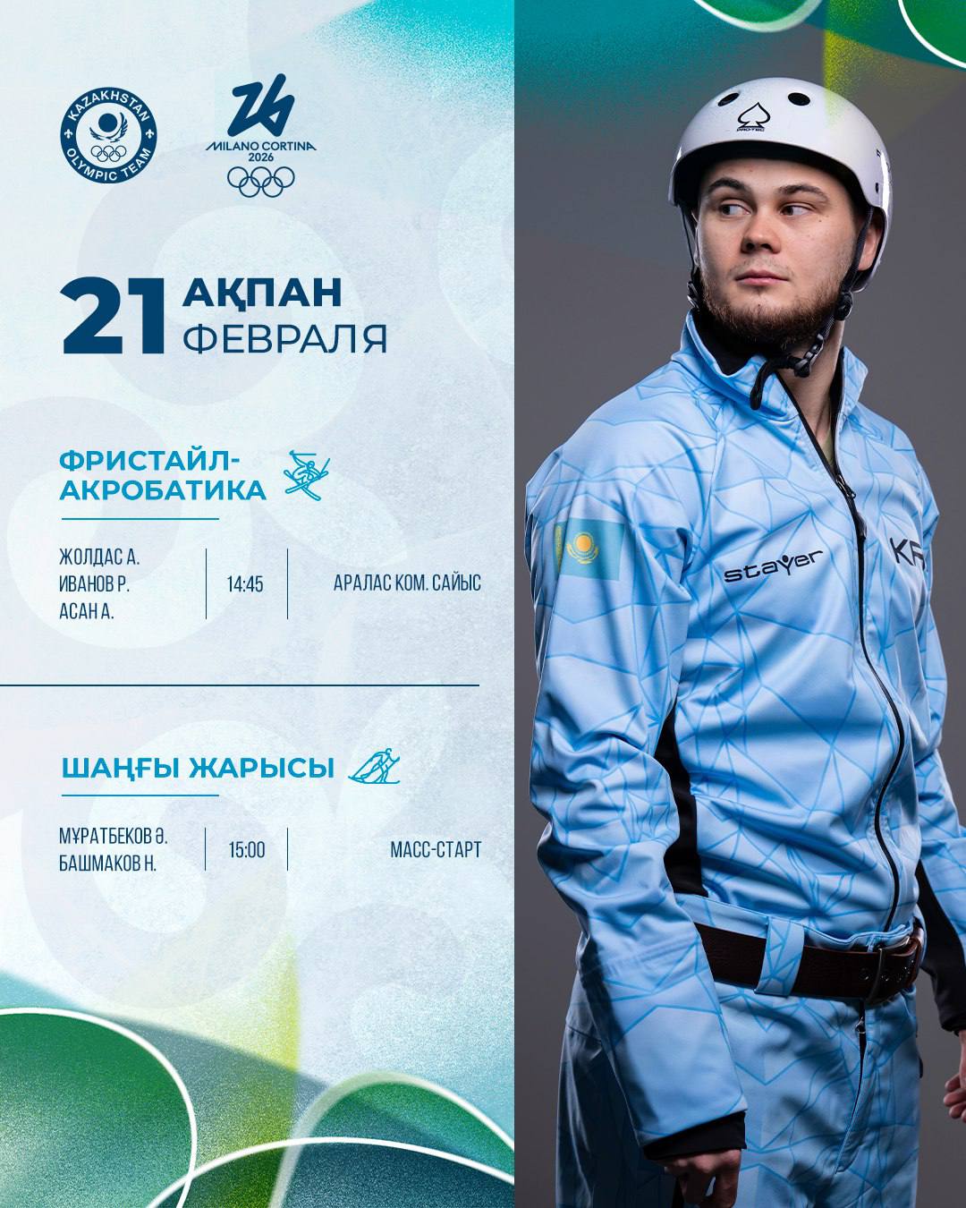 Первыми в олимпийский день включатся представители фристайл-акробатики. В 14:45 начнутся смешанные командные соревнования. В составе сборной Казахстана выступят Роман Иванов, Асан Асылхан и Аяна Жолдас. Уже в 15:45 состоится финал, где будут разыграны медали.
