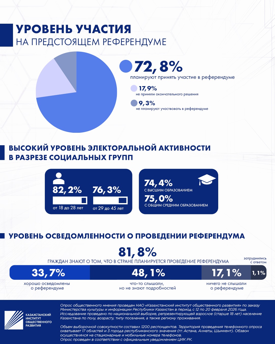 Казахстанский институт общественного развития с 12 по 20 февраля провел социологический опрос по изучению информированности населения о предстоящем референдуме и уровню поддержки гражданами проекта Новой Конституции. Респондентами стали 1200 жителей 17 областей, а также Астаны, Алматы и Шымкента.