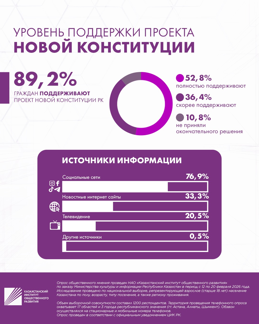 Опрос общественного мнения проведен НАО «Казахстанский институт общественного развития» по заказу Министерства культуры и информации Республики Казахстан в период с 12 по 20 февраля 2026 года.