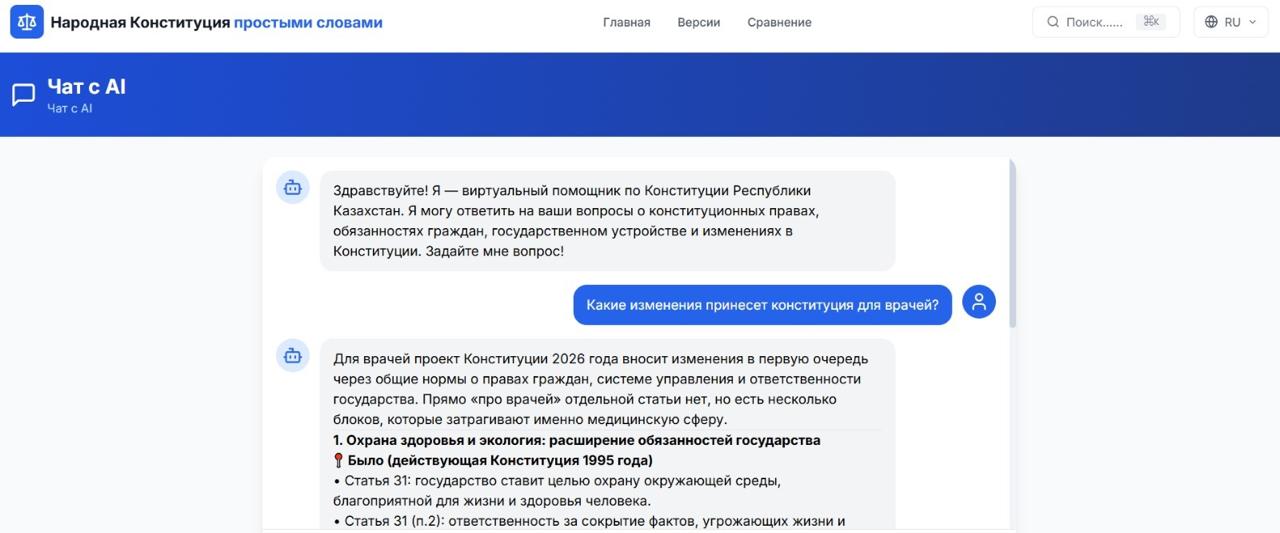Новая платформа представляет собой AI-сервис с встроенным чат-ботом, который помогает пользователям разбираться в поправках к Конституция Республики Казахстан и сравнивать различные редакции документа.