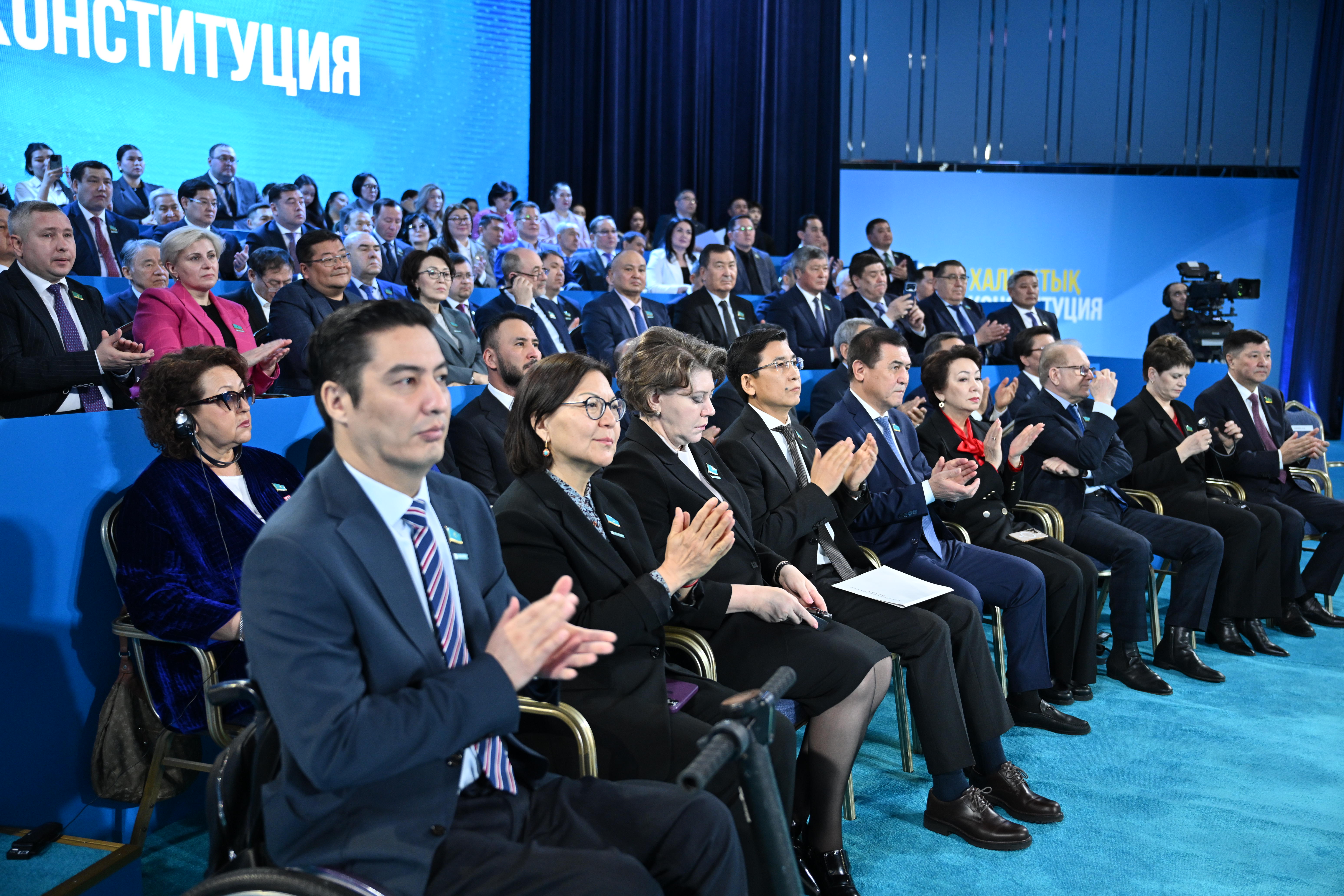 На мероприятии выступили Председатель Мажилиса Парламента Ерлан Кошанов, Государственный советник Ерлан Карин, Заместитель Премьер-Министра – Министр культуры и информации Аида Балаева и другие, передает Astana TV со ссылкой на referendum2026.kz.