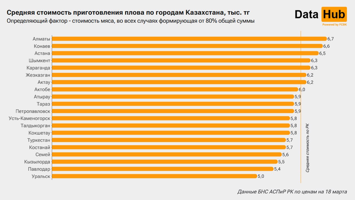 Расчеты вели на основании средней стоимости баранины, риса, лука, моркови и подсолнечного масла, которая у БНС АСПиР РК доступна по областным центрам и трем городам республиканского значения.